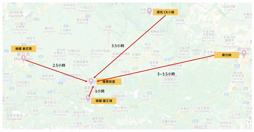 慕尼黑至薩爾斯堡:全程約6-8小時。