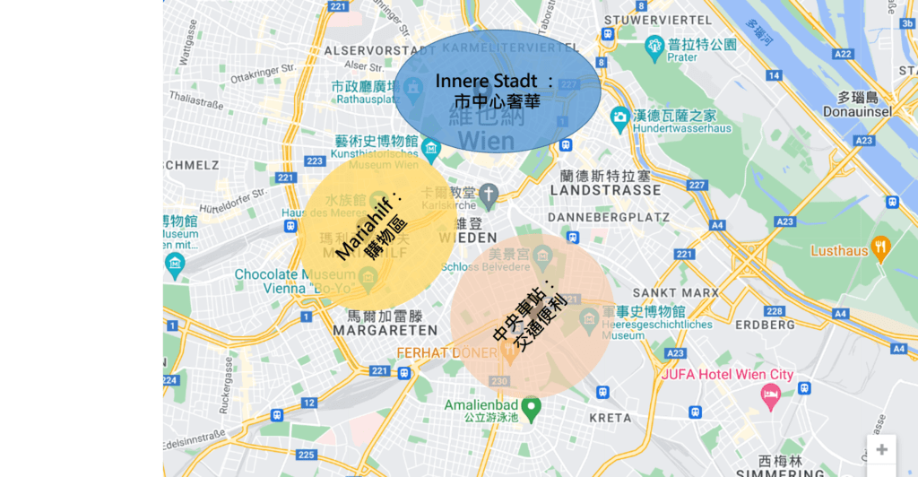 區域特色:該區交通極為便利,擁有多條地鐵線公交和步行可達的景點如聖史蒂芬大教堂與霍夫堡皇宮。
