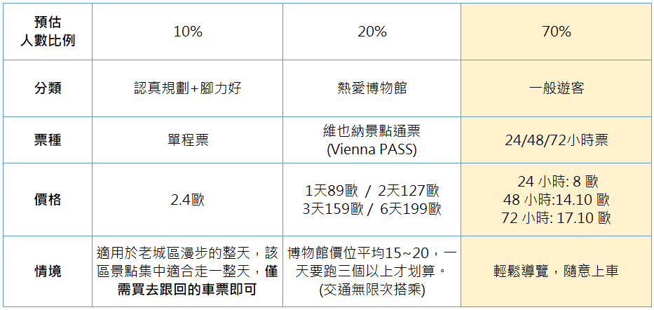 維也納的交通不會太複雜,我會直接建議買24、48、72小時票,大概可以滿足8成以上城市觀光的需求。