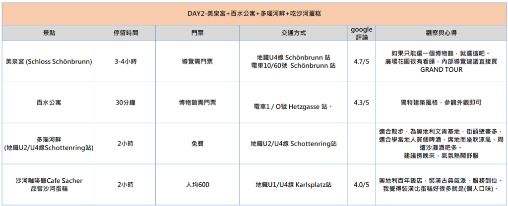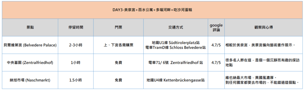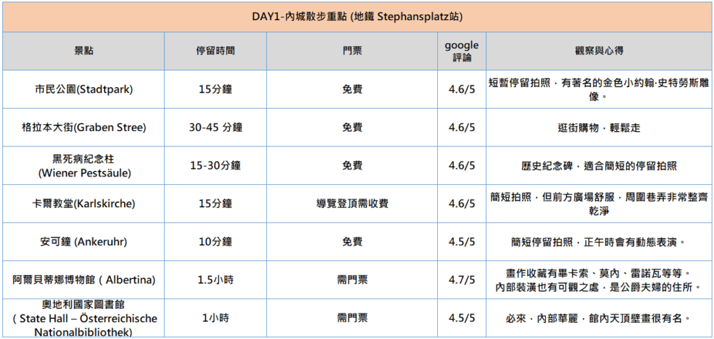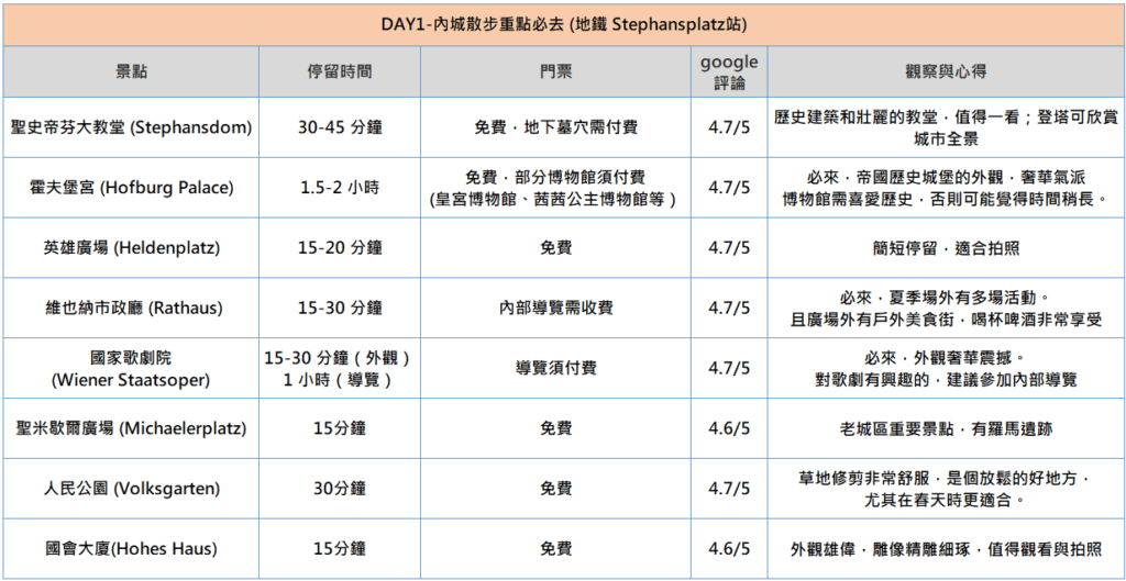 - 維也納擁有豐富的文化、藝術、音樂和歷史,是歐洲最美麗的城市之一,如果只有2~3天該如何選擇?列出各景點摘要,方便參考。