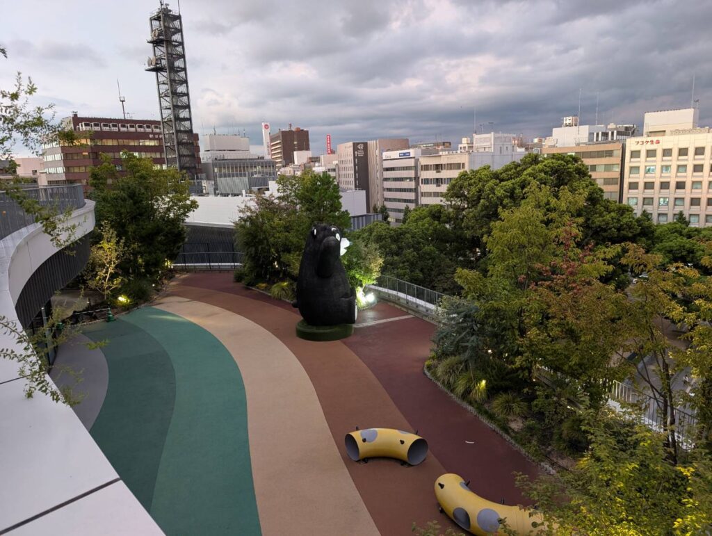 這邊重點是每個樓層幾乎都有露臺,且頂樓的空中花園,無論造景和規模都很值得一去,也是適合小孩子放電的地方,當然這邊也有一座巨大的熊本熊雕像~