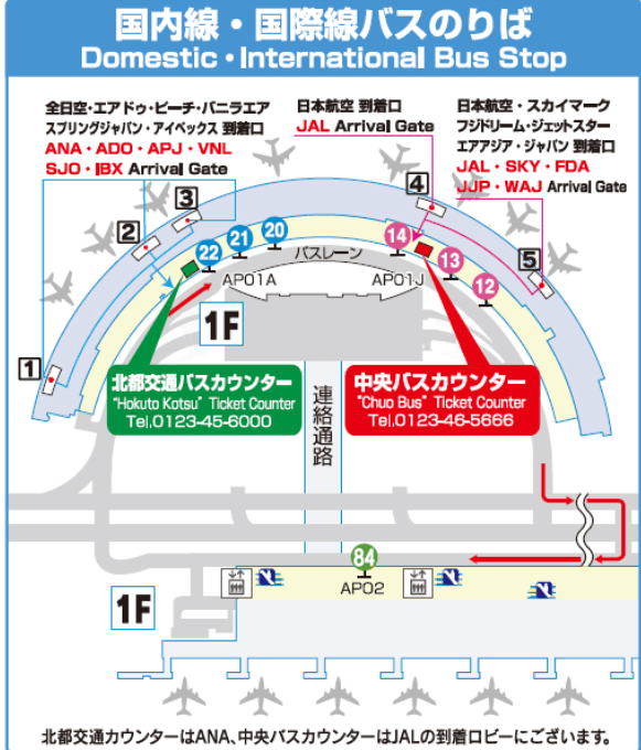 • 買票:到機場一樓入境大廳,找 「中央巴士 (Chuo Bus) 紅色櫃台」「北都交通 綠色櫃台」